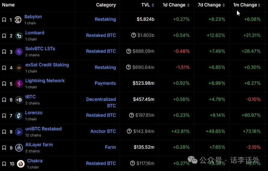 至于比特币生态相关的代币数量(包括铭文、符文什么的概念)则就更多了,数不胜数。而从目前不同协议的锁仓量情况来看,大部分价值都被锁定在 Babylon 和 Lombard 等头部的几个质押协议中。如下图所示。