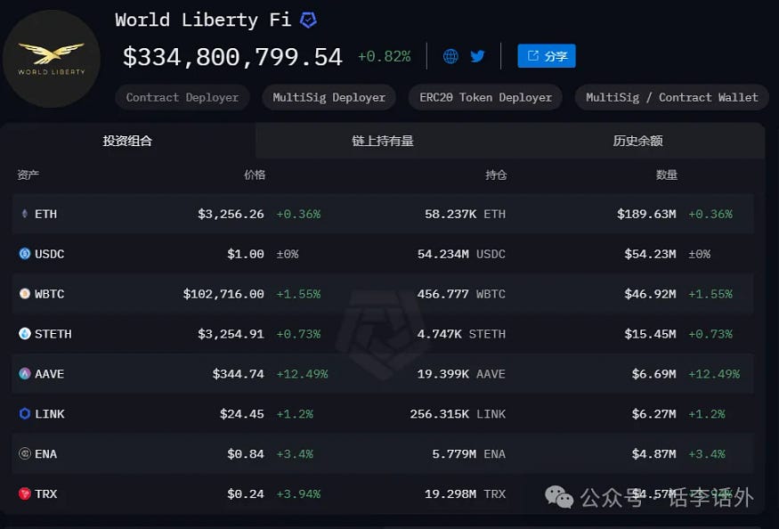 目前 WLFI 主要持仓的币种包括 ETH、AAVE、LINK、ENA、WBTC、TRX 等。如下图所示。